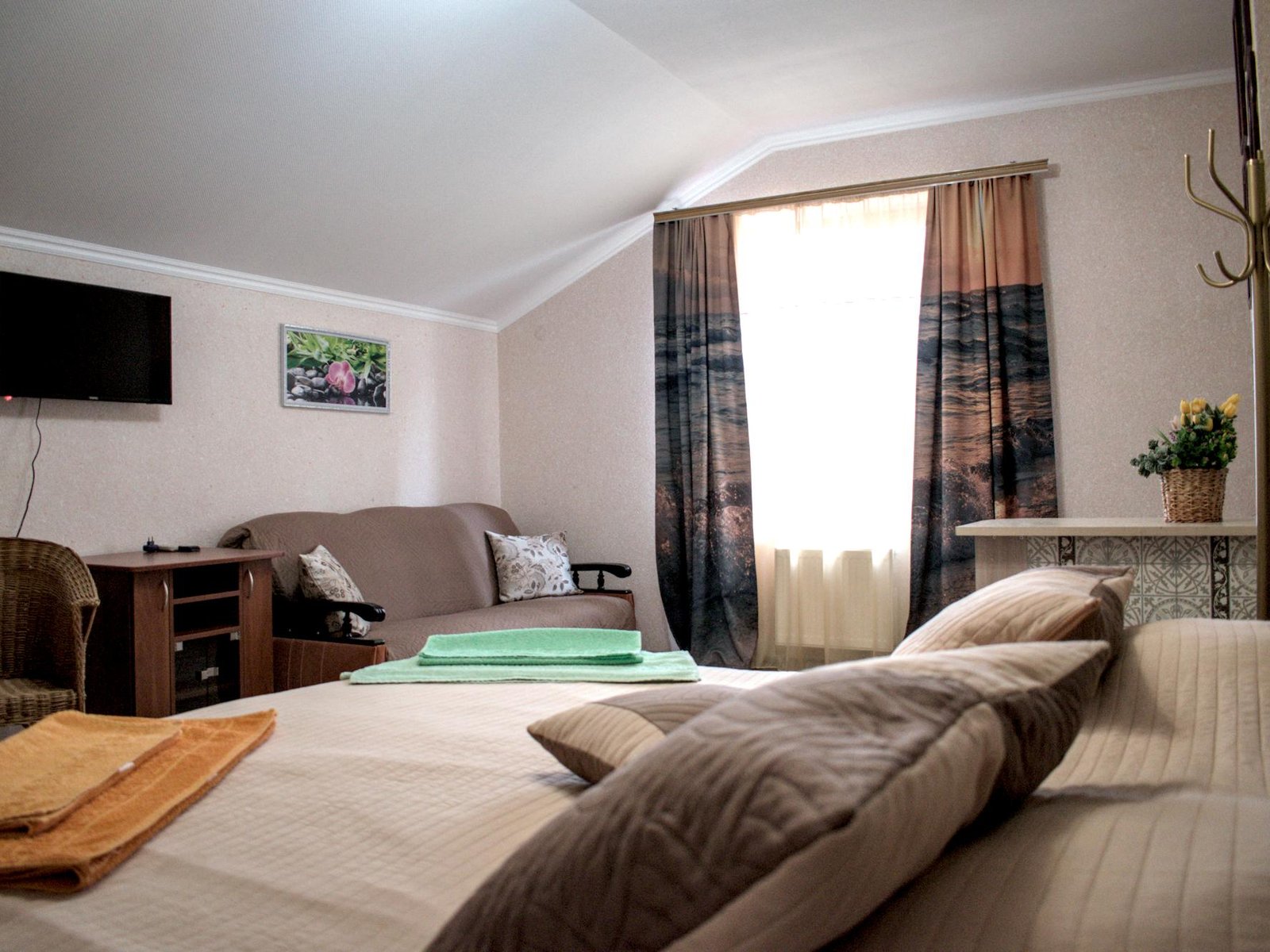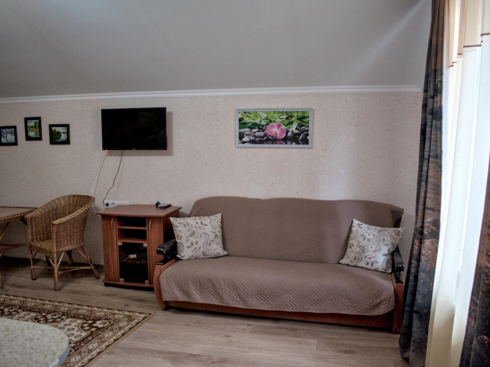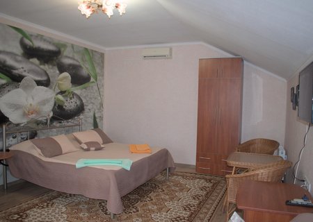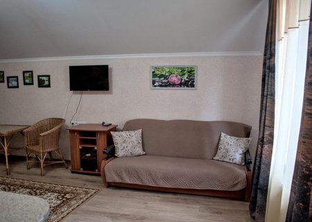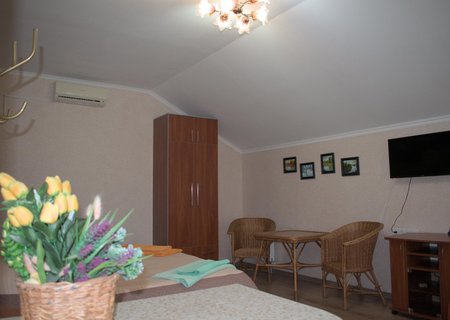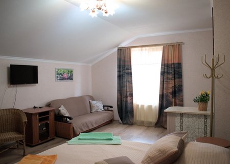 Просторный двухкомнатный номер, рассчитанный на размещение до 6-ти человек (есть возможность добавить одно дополнительное место). В первой комнате расположены одна 2-х спальная кровать и двухспальный диван. Во второй комнате один двухспальный диван. Имеется отдельный балкон.