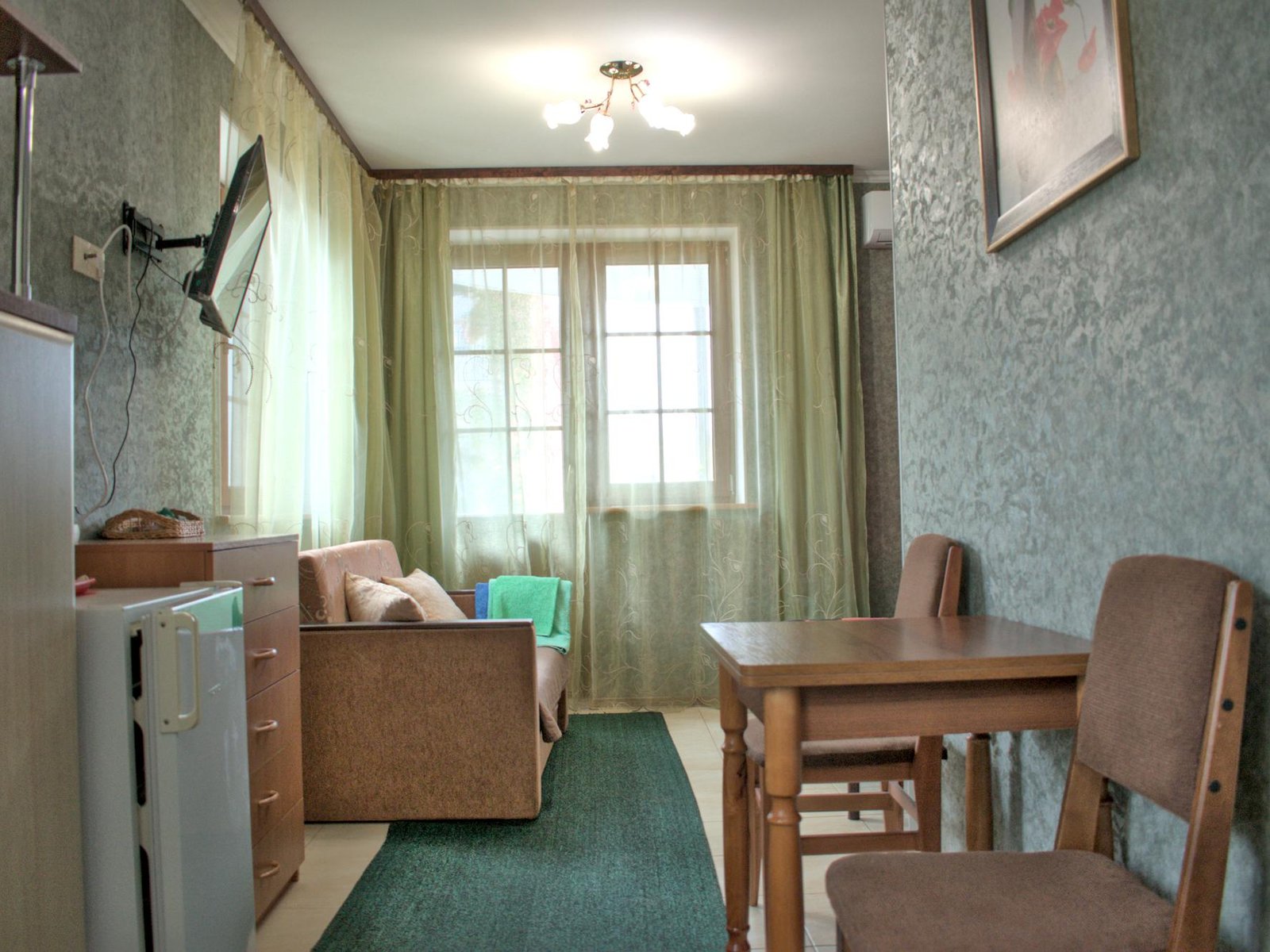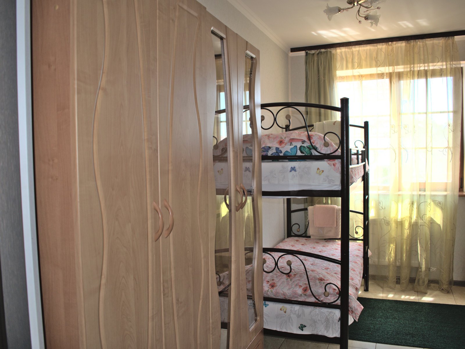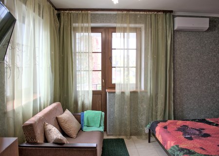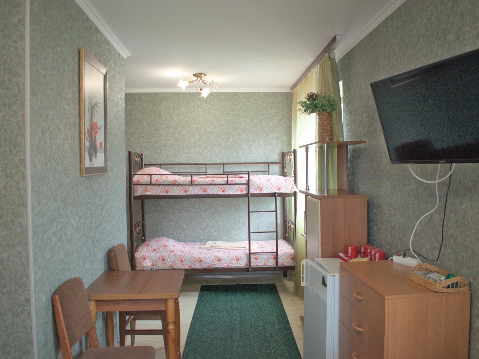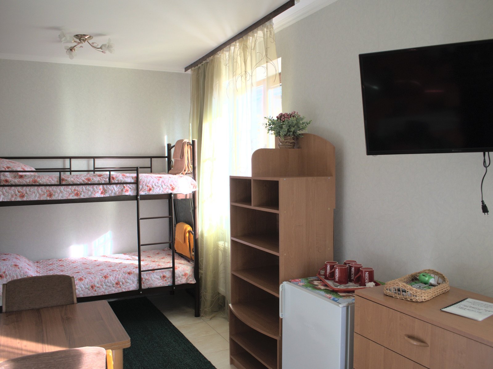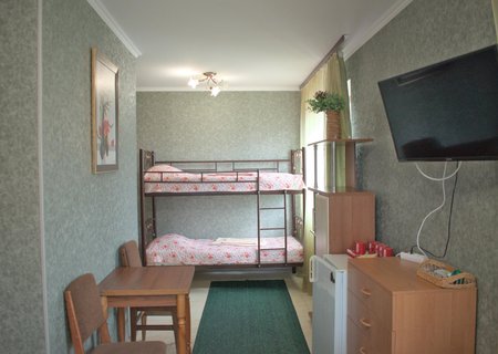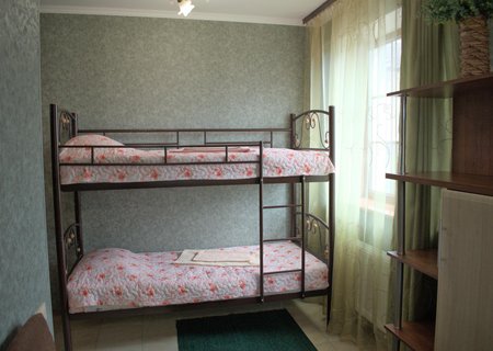 Удобный недорогой номер для большой семьи. В номере имеется большая двухспальная кровать для родителей, удобная двухъярусная кровать для детей и диван. Также в номер можно добавить еще одну небольшую кровать для дополнительного места. Номер оборудован всем необходимым для семейного отдыха в Феодосии. Кроме этого, мы предоставляем отлично оборудованную кухню, уютный зеленый дворик и беседку для отдыха всей семьи. Для детей во дворике имеется детская площадка с песочницей, красочным домиком, ярким комплектом стола и стульев, мячей, игрушек.